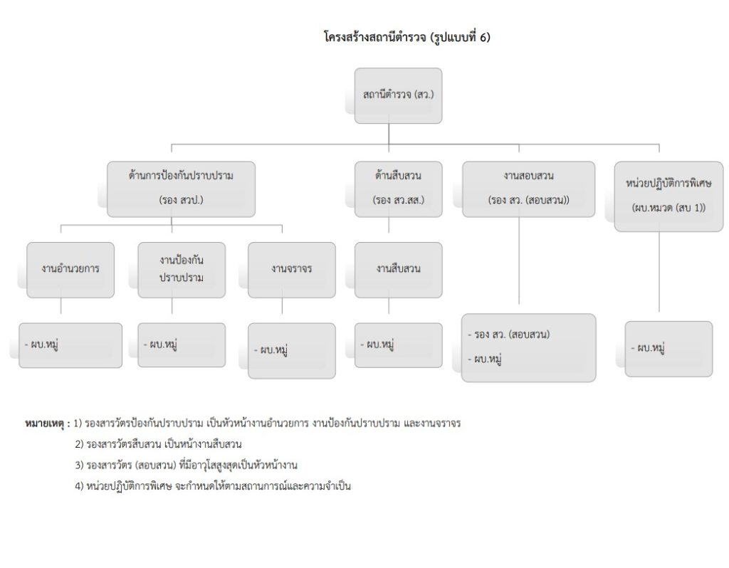 มีหน้าที่เกี่ยวกับการจำนวยการ การวางแผ่น การตรวจสอบติตตามและประเมินผลงานที่เกี่ยวกับนโยบาย ยุทธศาสตร์ และแผนงานของสถานีตำรวจ งานการบริพารบุคคากร งานจเรตำรวจงานกิจการพิเศษ งานความมั่นคง การศึกษา การมิกอบรม งานวิชาการ สวัตติการ การฟัฒนา การบริหารจัดการ งบประมาณ การเงิน การพัสตุ การพลาธิการและสรรพาวุธ การส่งกำลังบำรุง รวมทั้งลักษณะงานอื่น ๆ ที่เกี่ยวร้องหรือเป็นส่วนประกอบของงานดังกล่าว เพื่อส่งเสริมหรือสนับสนุนการปฏิบัติงานของสถานีตำรวจ